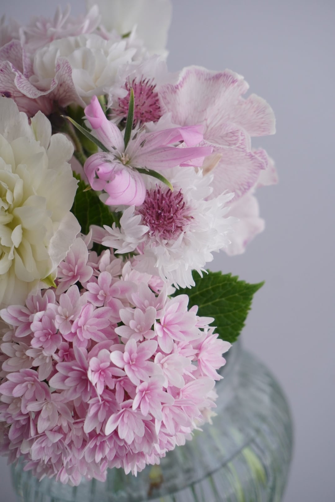 くすみのない明るいピンクに癒されるとても春らしい花束です。